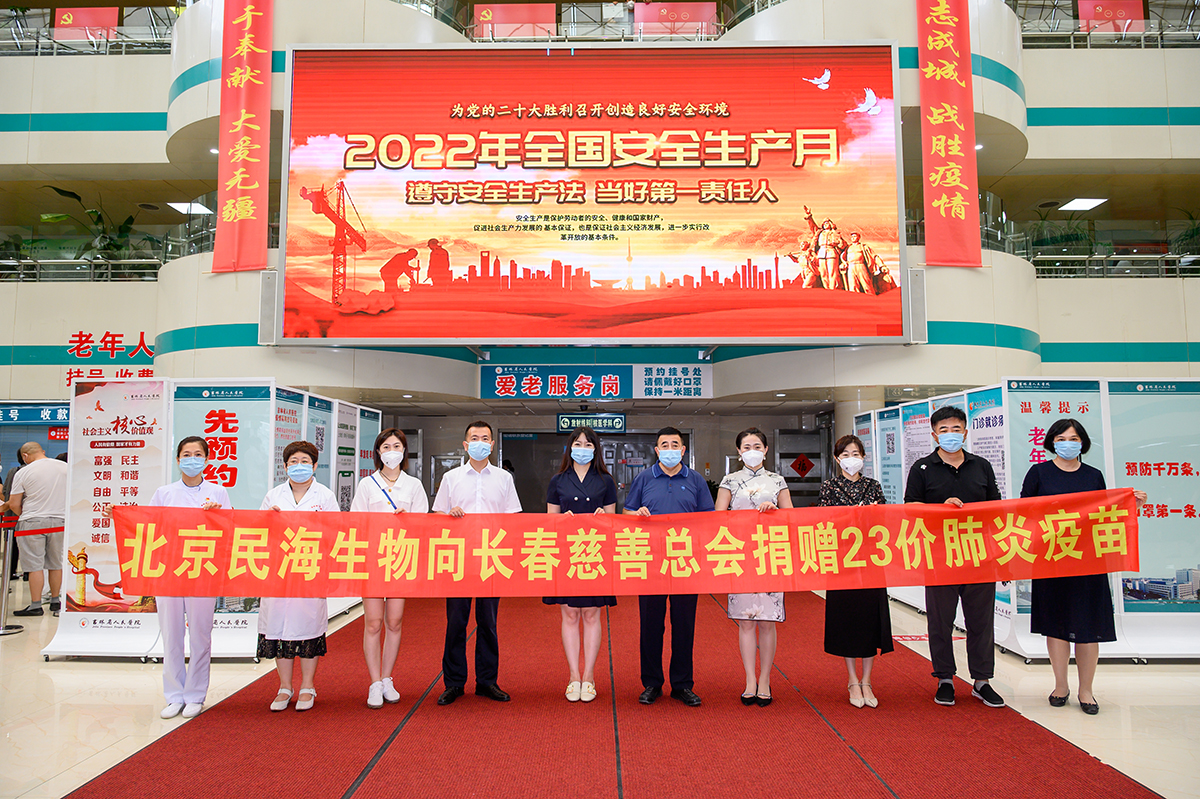 7月4日上午,北京民海生物科技有限公司在吉林省人民医院举办慈善物资捐赠仪式,向长春市慈善会捐赠价值396000元的23价肺炎疫苗,该物资定向用于长春市朝阳区疾病预防控制中心、吉林省人民医院新冠肺炎防疫一线工作人员。出席本次捐赠仪式的领导有长春市慈善会滑正涛秘书长,姜巍,张琪;长春市朝阳区疾控中心的王宇光科长,吉林省人民医院的高凯副院长,院办陈丽主任,审计科付磊科长,急诊胡轶虹主任,北京民海生物科技有限公司的肖慧馨,吉林省销售经理张立萍。