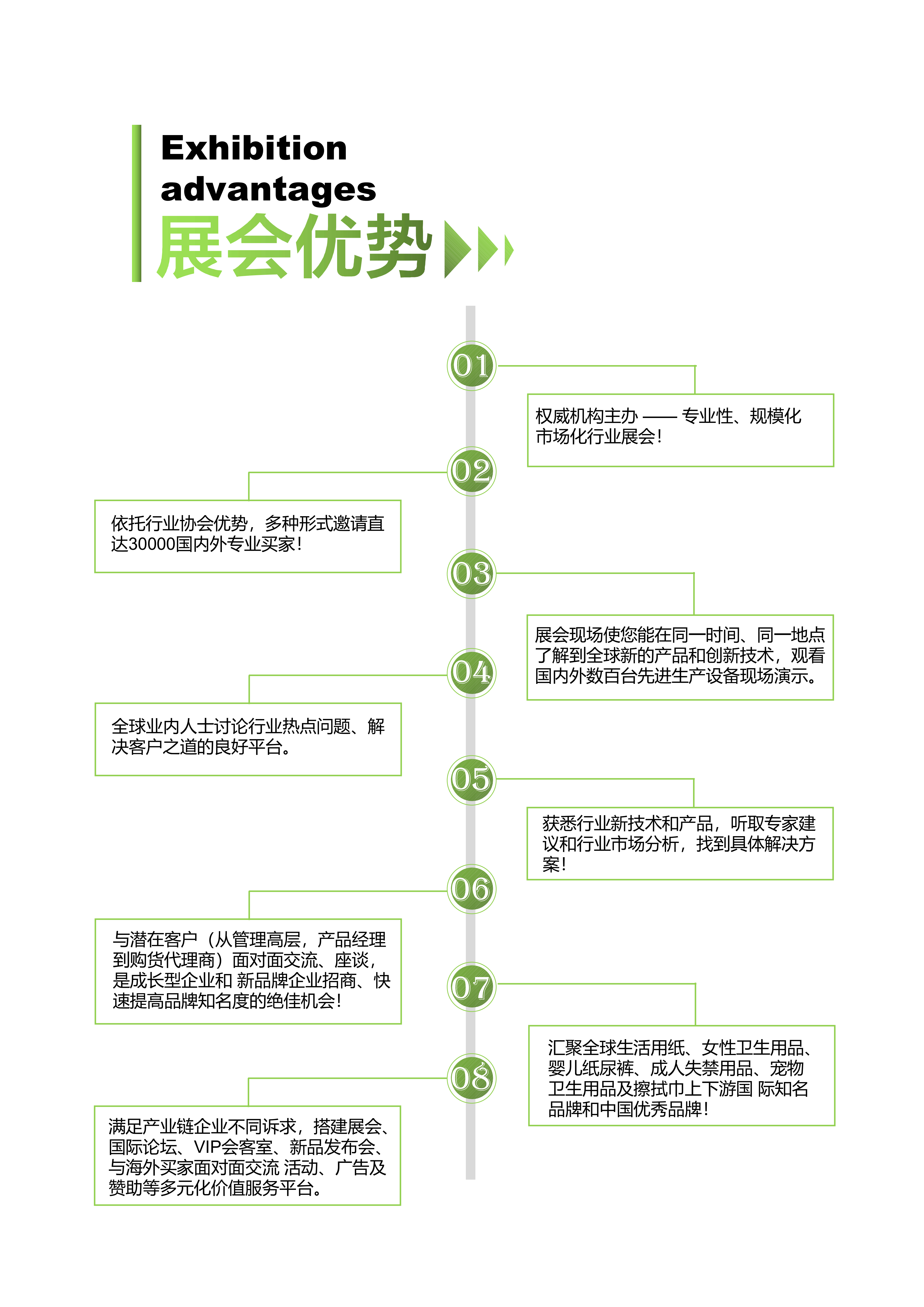 生活用纸展区: 原纸、卫生纸、手帕纸、面巾纸、餐巾纸、湿纸巾、柔巾卷、产妇用纸、厨房用纸、擦拭纸、一次性马桶坐垫、一次性消毒湿纸巾和一次性鞋垫;防护服、防护口罩、手术衣、纱布片、绷带布、复合基布等纤维制品等。